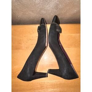 This is a very nice pair of Stuart Weitzman Suede & Leather Kitten Heels. They are a size 8.5M and in excellent condition. With very very little wear.