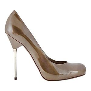 Stuart Weitzman Olive Green Patent Leather Round Toe Stilettos Silver Heels 8 M
