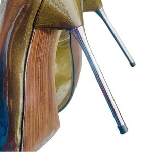 Step out in style with these elegant olive green patent leather stiletto heels by Stuart Weitzman. Features a round toe. Perfect for any occasion, these shoes offer a sleek and sophisticated look. Shoe size 8M. Heel height 5". Good preowned condition. Smoke-free environment.