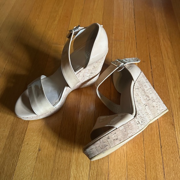 Height and comfortable—worn once or twice? Patent leather with cork wedges—buckle closure. Red stain at front of toe-bed on one shoe and a black sharpie or storage mark behind the buckle closure. (I don’t know, I sometimes am a walking disaster?) Have not tried to remove—but shoes were sanitized.
