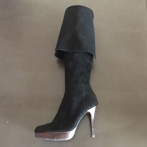 Stuart Weitzman Hiho Over the Knee Black Suede Boots. Side zip. Notch and elastic inset behind Knee that allows Boot to be folded over for knee-high look. 1" platform and 4" stacked heel in contrast. 26" shaft and 18.5" circumference. Rubber sole. Condition is like new. Only worn one glorious time.