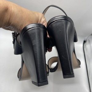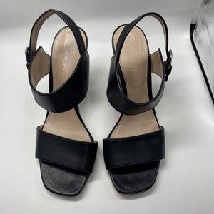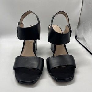 Beautiful unique sandals with wide black leather straps that offset the triangle block heel. Perfect sandal for night and day and any occasion. In great preowned condition with a few small scratches to leather. Looks to only have been worn one or two times, also looks like a pad was glued down inside the sole then removed. Please examine all pictures. Size 8 in a wide width. Comes from a smoke free home. Retail cost $425
