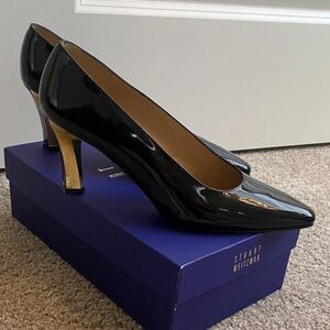 Stuart Weitzman black patent leather heels with a gold heel accent. 3” heel. Size 9.5. Like new condition. Perfect for adding elegance to any outfit.
