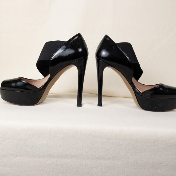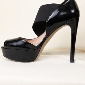 Stuart Weitzman Patent Leather Peep Toe Heel 7M. STUART WEITZMAN, pumps high heel open toe leather/goatskin/rubber. Platform, stilletto. Cross wide black strap. Excellent used condition. Wear on bottom sole (pictures) Uppers are in great shape.