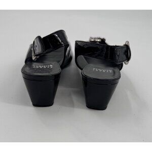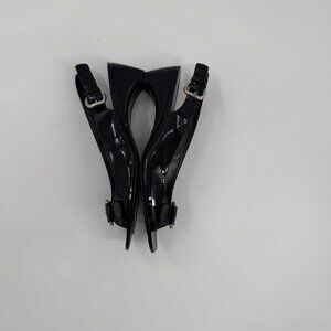 Super Slim Stylish slingback heels featuring a sleek black patent leather finish and elegant silver buckle detail, designed for a polished and sophisticated look.