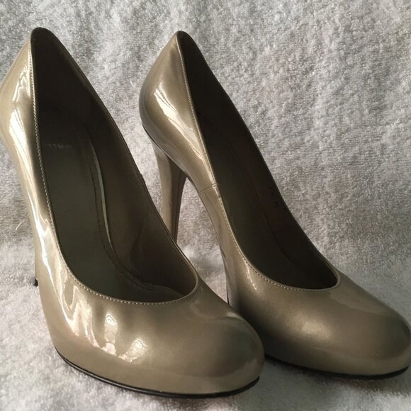 Stuart Weitzman Patent Leather Round Toe Heels in Tan (7.5 M)