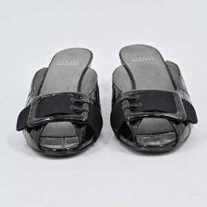 These Stuart Weitzman mule wedges offer polished sophistication with an easy slip on silhouette and glossy patent finish. Designed with a peep toe front and supportive wedge heel, they provide a smooth structured feel with comfortable lift for all day wear. The sleek profile and minimal detailing make them ideal for professional settings, dressy casual looks, or elevated everyday outfits, appealing to those who value refined designer footwear with practicality.
