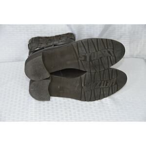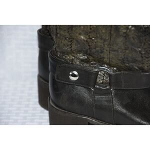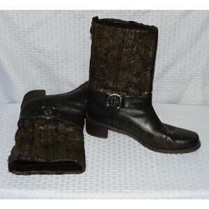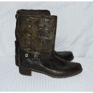 Unique mid calf boots from Stuart Weitzman! Rich dark brown color. Pull-on style is Lacquered Pimlico with a coated cable knit woven upper. Harness detail with silvertone buckle hardware for a motorcycle inspired look. Rubber sole and 1.75" heel. Gently worn