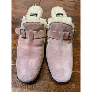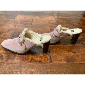 Stuart Weitzman Pink Suede Lambswool Lined Mule Heels Buckled, Size 7.5