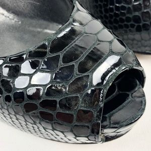 Stuart Weitzman snake embossed pump, similar to the SW 'Logo Plainfield' style but with a slimmer heel. Color: Black Crystal (with a slight shimmer, as shown on third pic). Shoes have some light creasing on toe box from wear (fourth pic). Please see last pic for two minor flaws. Overall great condition.