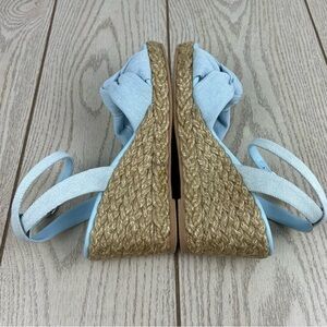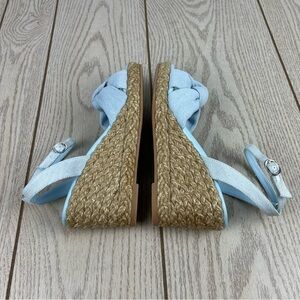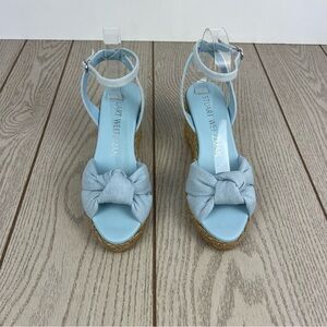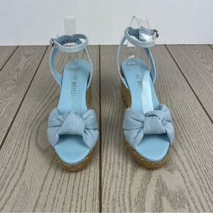 New in box, Stuart Weitzman Playa Espadrille Knot Wedge Sandals, size: 38/7.5B women's, color: VDJ-Vintage Denim / Jute (light blue) , MSRP $395, in box.