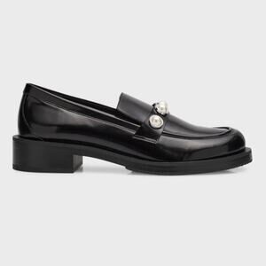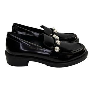 Stuart Weitzman Portia Bold Loafers Black Leather w Pearl Detail Size 8.5 Spain