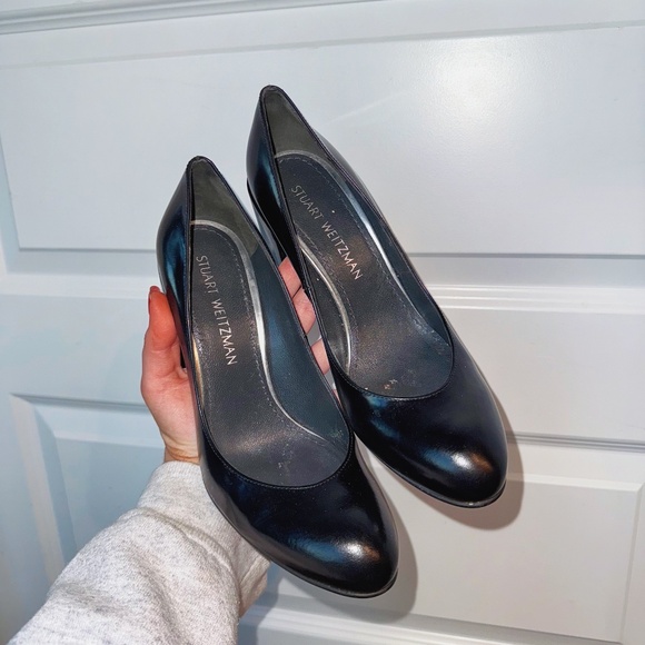 Stuart Weitzman Pronto Jet Mirror black patent leather block-heel pump