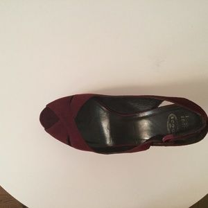 Burgundy Seude Stuart Weitzman Peep-Toe Slingback Platform Shoe with 4 inch heel wrapped in crinkled leather