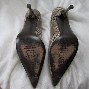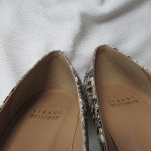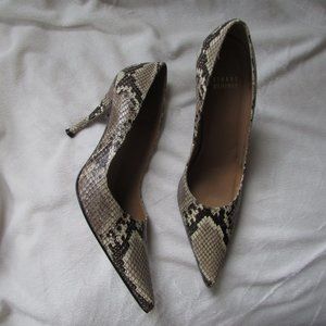 Size 7.5 Stuart Weitzman python printed pump heels. Pointed toe. Cream colored, gray and black. 3.5" heel.