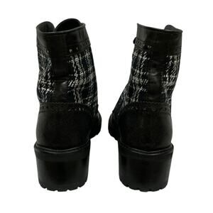 Step into timeless sophistication with these rare Stuart Weitzman Brogue Ankle Boots, a designer women’s style that blends heritage-inspired detailing with modern edge. Crafted from premium black leather with contrasting black-and-white plaid textile panels, these boots stand out as a unique, hard-to-find style. With a lace-up front, brogue perforations, and a chunky block heel with lug sole, they balance polished design with durable wear