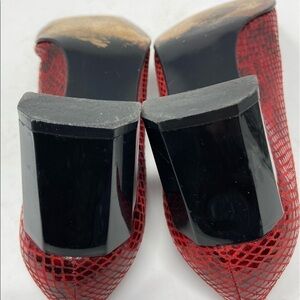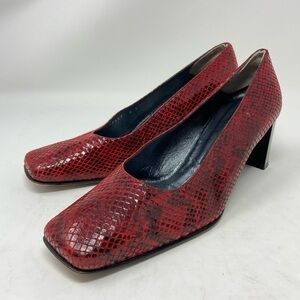 Stuart Weitzman Pumps Red and Black Snake Embossed Leather. Block Heel. Leather Sole. Women’s size 6C (wide). Heel height is approximately 2 inches. These are preowned with some signs of wear. Specifically inside the soles there is some wear. Also one of the shoes has a slight indentation on the inner side of the shoe. I do believe that wearing the shoe would resolve the indentation. Please see pictures for details!