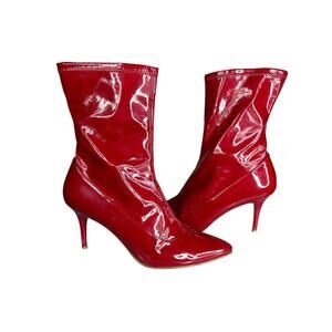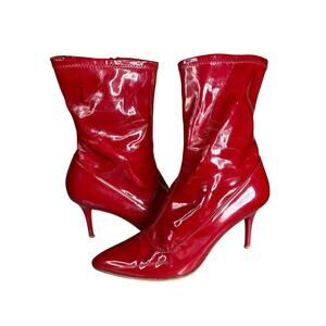 Stuart Weitzman Red Patent Leather Mid-Calf Boots 8M Pointed Toe Heels Zip