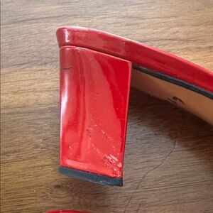 Chic red sandals featuring stylish silver studs. Designed by Stuart Weitzman. 2.75” heels. Overall length of shoe 10.5 inches. Some scuffs on heels as shown in photograph. Otherwise in great used condition.