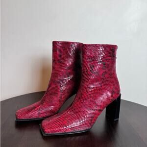 Stuart Weitzman boots, Stuart Weitzman ankle boots, Red snakeskin boots, Snakeskin ankle boots, Red leather boots, Designer ankle boots, Square toe boots, High heel boots, Block heel boots, Retro Glam, Punk, Edgy