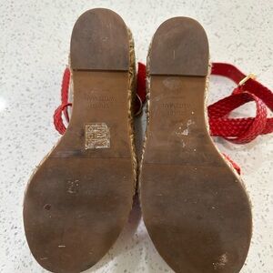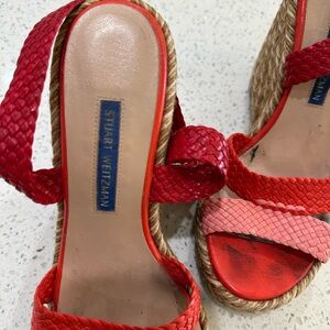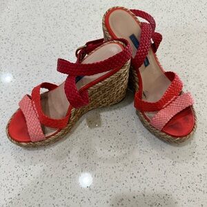 Chic woven wedges with vibrant red and pink straps. Stylish and comfortable for any outing.