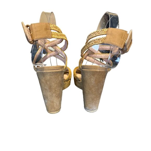 Stuart Weitzman Reins Camel Braided Leather Trim Strappy Wedge Sandals Sz 9