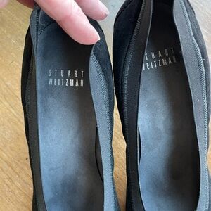 Stuart Weitzman Round Toe Black Suede Platform Heels. Step out in style with these elegant black suede heels. Perfect for so many situations, these shoes offer both comfort and sophistication. Round toe. Soft stretchy band around the top. Low 1/2 inch platform. 3 inch heel. Suede leather uppers with synthetic sole. Gently preowned in excellent condition.