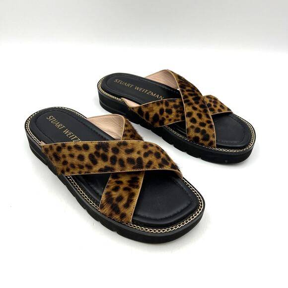 Stuart Weitzman Roza Lift Chain Haircalf Sandal Sides Leopard Print Flatform