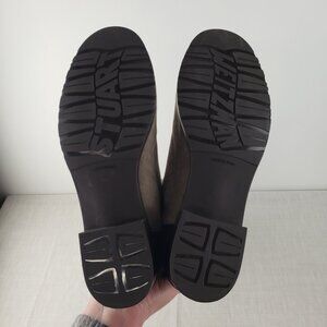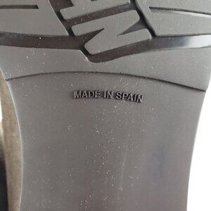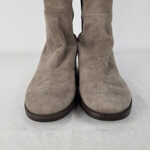Pull on tall boots with grayish beige suede front and brown elastic back. Stacked 1.125" heel. Round toe. Made in Spain.