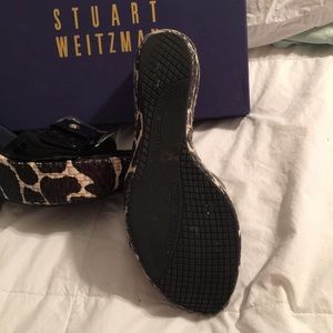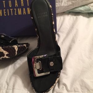 Black and with animal print sandals. No damage. Matching handbag in closet.