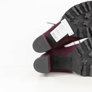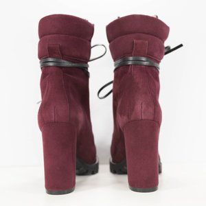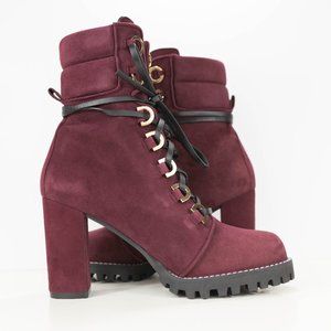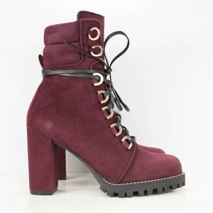 Suede combat boots revamped with feminine ankle ties and slick grommet trim.