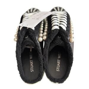 Stuart Weitzman shearling sneakers, pearl-embellished sneakers, luxury casual shoes, black leather designer sneakers, Stuart Weitzman winter sneakers, stylish warm sneakers, high-end fashion sneakers