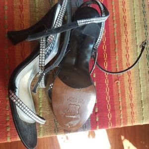 Beautiful Peau de soie shoes with rhinestone straps 3 inch heel, worn 2x inside looks more worn as I had a stick on cushion on them. Have knee issues now.