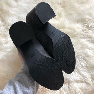 Drawstring opening with bow back detail. Pull on style. Wrapped block 3.5” heel. Allover suede construction. Stretch suede upper.