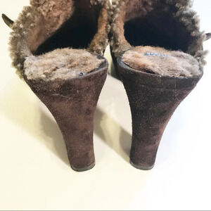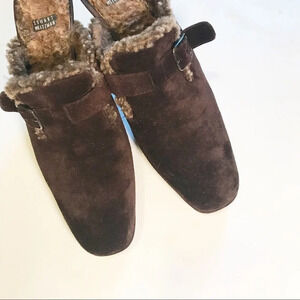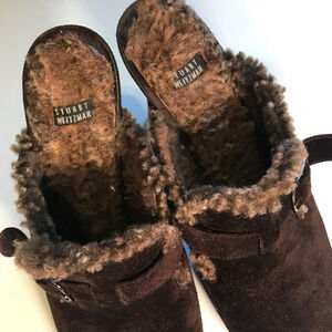 Stuart Weitzman Brown Platform Mules Clogs Buckle Fuzzy Faux Fur Lining