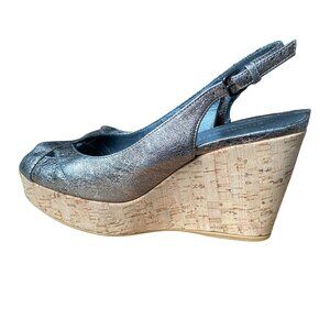 Stuart Weitzman - Silver Gray Metallic Slingback Cork Wedges Peep Toe - Size 8
