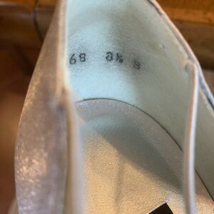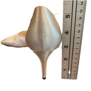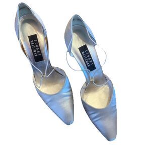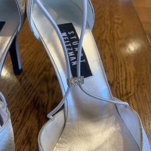 A stunning pair of silver high heels from Stuart Weitzman. The size is an 8 1/2 B. 3"heel. Adjustable stretchy strap with rhinestone slide with a padded toe sole. Perfect for so many occasions. I have pointed out some minor flaws, however, these beautiful shoes are in good condition. They will be shipped in a rigid box to protect them during shipping.