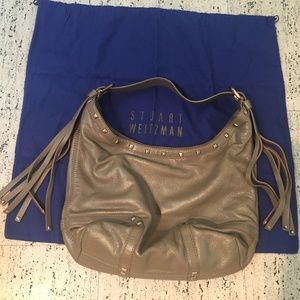 This is such a fun bag by Stuart Weitzman, silver in color and featuring studs, tassels, and a magnetic closure. It's so much fun. This bag is in great shape, one small scratch on the sidenear the buckle, see picture. Dust bag included. 16"W, 10"H. Such a fun piece!
