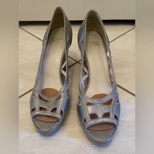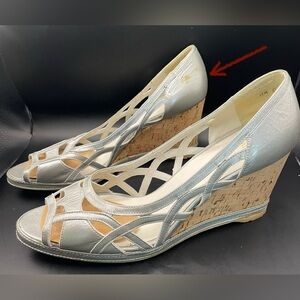 Stuart Weitzman Silver Metallic Leather Cork Wedge Sandals Peep Toe Cutout Sz 10