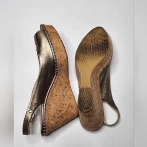 Chic metallic wedges with a cork heel. Stylish and comfortable for any event.