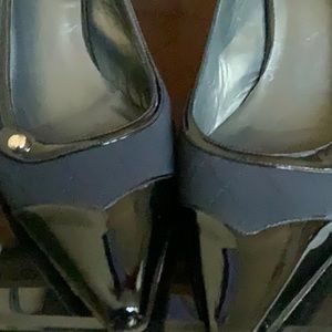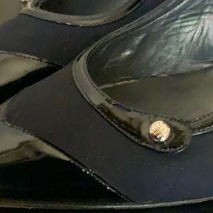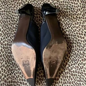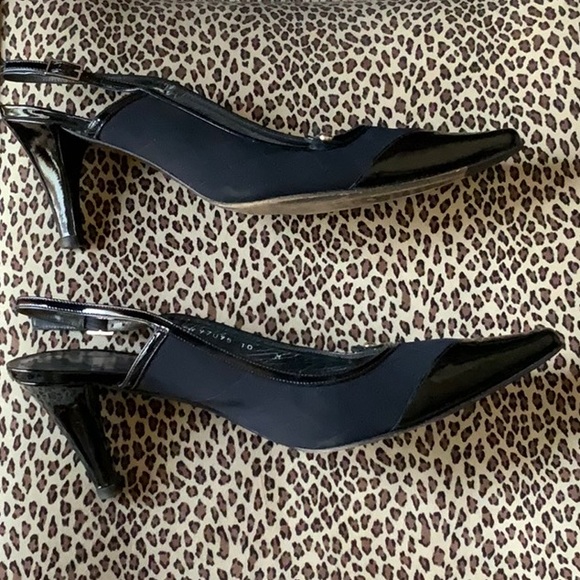 Oh Joy! This is a beautiful navy sling with a patent leather toe, strap heel and trim. They are timeless! Look closely for the slight quilting pattern. Great respectable heel for work, church or any other event. As pictured, there is no scuffing. Excellent condition.