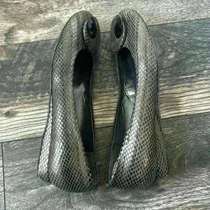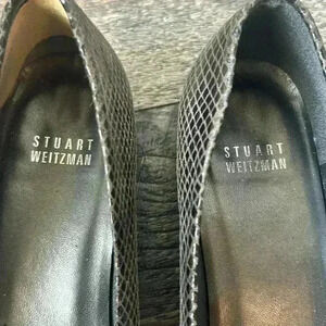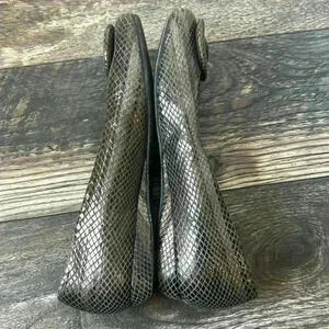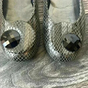 Women’s 7.5 N Stuart Weitzman flats…silver snake skin with jewel top. Great condition