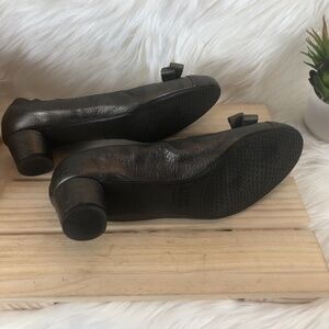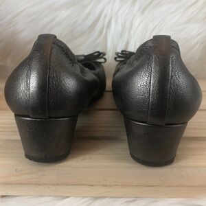 Stuart Weitzman Slip On Pewter Brown Ballet Heels Pumps. Chunky round heel, elastic collar, bows in the front. Pre-owned condition, normal wear. No major defects. Please see images for condition.
