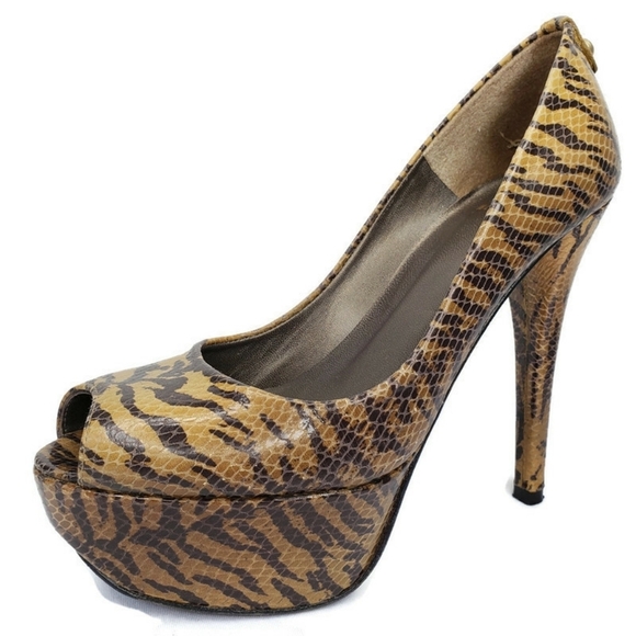 Stuart Weitzman Snake Tiger Print Platform Peep Toe Stilettos Pumps