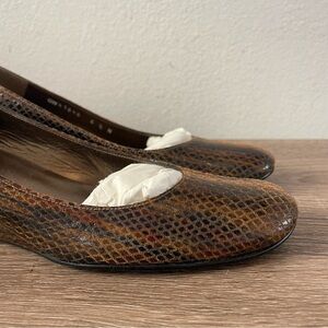 Super cute vintage Stuart Weitzman snakeskin round toe wedges. Size 6.5 NARROW. These are in great preowned condition; no visible flaws.