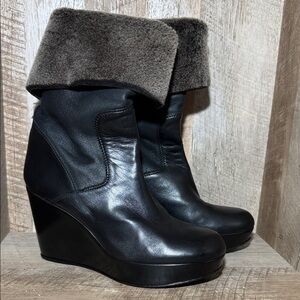 Chic black leather boots with a stylish brown fur cuff. Elevate your look with these elegant wedges.