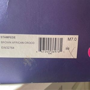 Stuart Weitzman "Stampede" mid-calf boots in the "Brown African Croco" style. Embossed leather in printings of ostrich, python and crocodile upper. Brass-tone studs. Instep side zipper. Almond shaped toe. Approximately 3" stacked heel. Upper: Genuine Leather, Insole/Lining: Genuine Leather, Sole: Man-made materials. Size: 7M. Does not come with full box. Excellent condition.