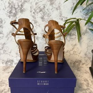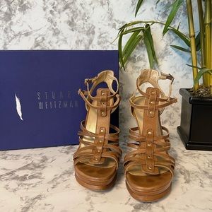 Stuart Weitzman Strappy leather platform sandals with wood heels in size 9. Color is Toffee Vecchio Nappa. Gold Hardware and buckles. Leather soles. Good condition w/box.
