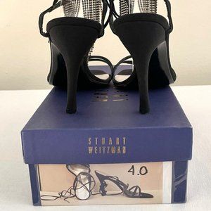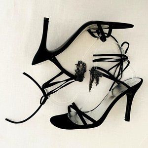 Stuart Weitzman Streamlines Women's Strappy Heels in size 8, a chic black design with stunning rhinestone tassels. Suede straps wrap up the leg. These shoes feature a 4" heel and a comfortable leather sole.