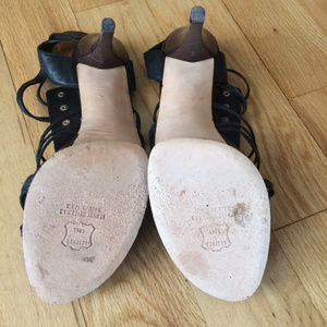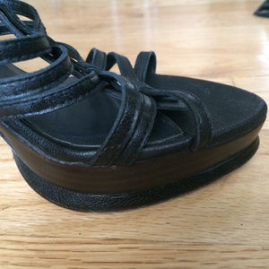 Size 9 Stuart Weitzman Black Platform Sandals. Worn only once. Extremely comfortable for the heel height because of the 1" platform. Straps also support your feet well. The platform and heel are a very dark stacked wood. Studs and buckles are silver-tone. The inside heels have a few minor nicks on them. These make your legs look great! Leather, made in Spain.